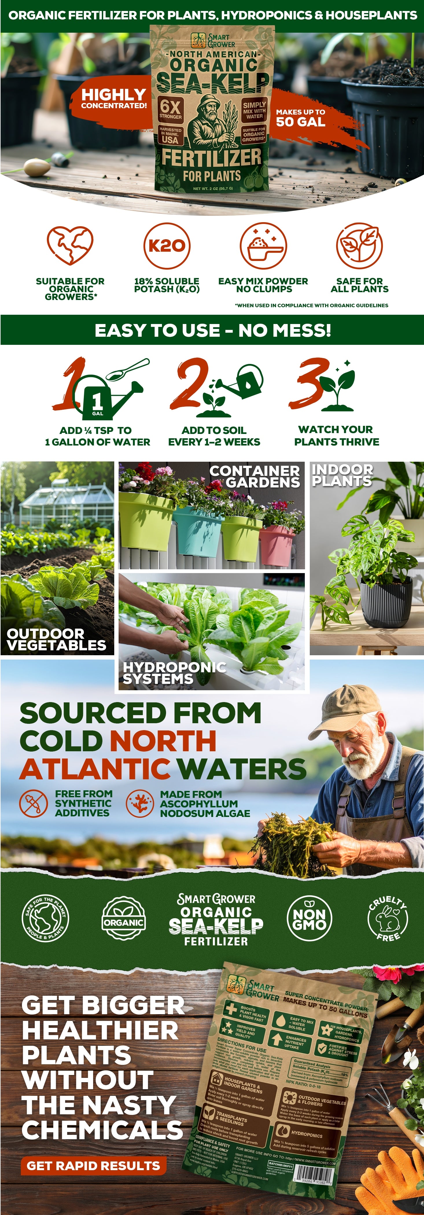 - Easy-to-Use, and Compatible with Nutrients - Smart Grower Sea-Kelp fertilizer is fast-dissolving and easy to mix with water, simply apply every 1 to 2 weeks for stronger plants and bigger yields for all types of plants, gardens, and growing mediums