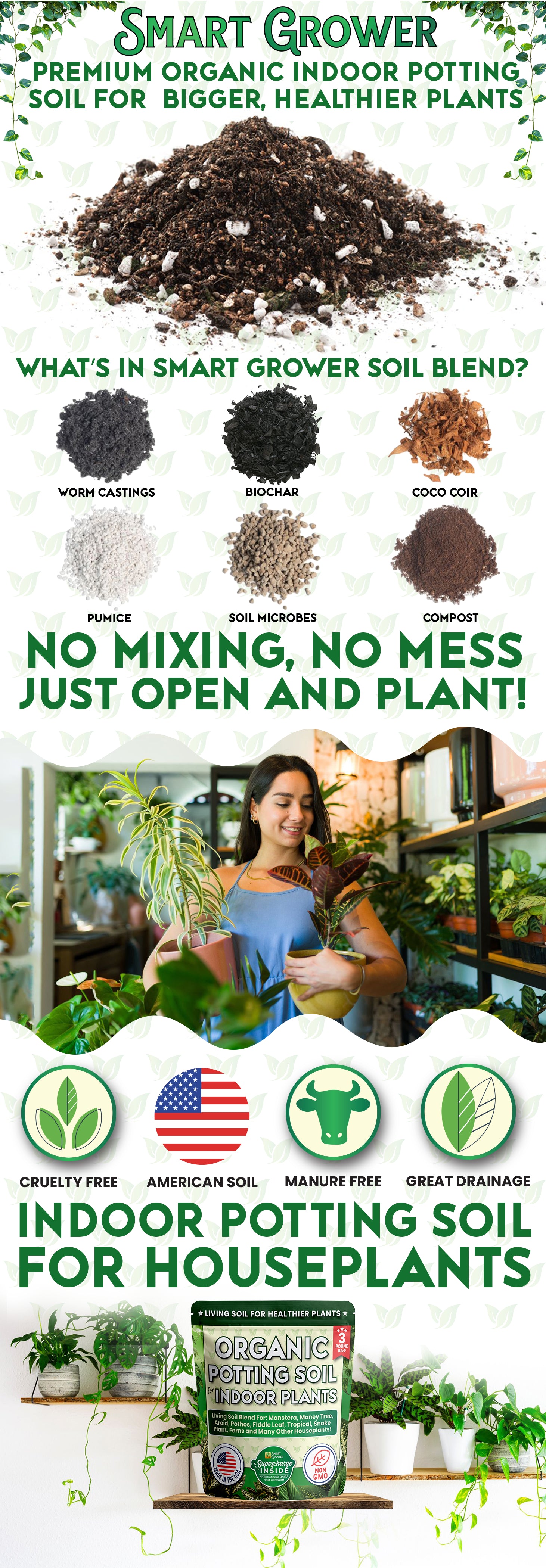 - Save Time and Effort with Your Plants– No need for mixing or expanding soil—just open and plant! Smart Grower organic indoor potting soil provides a hassle-free, nutrient-packed living soil with superior drainage to prevent overwatering and root rot giving you a quick, no -fuss solution for happier indoor plants.